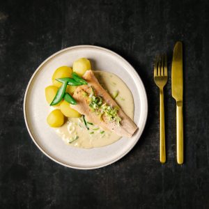 • Fjällröding, vitvinsås,duchesspotatis för 2 personer.